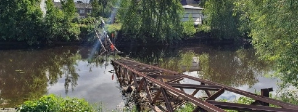 Воздушный трубопровод теплосети поддерживался металлическими конструкциями и проходил над рекой. Порыв ветра повалил старое дерево на теплосеть, и вся конструкция оказалась разрушена.