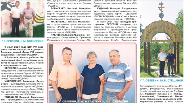 В июле 2021 года Геннадий СЕЛЕБИН совершил поездки по районам области, в которых встретился с руководителями представительств Партии «РОДИНА» в муниципальных районах Брянской области – членами Регионального Избирательного Штаба. Председатель Регионального отделения Партии «РОДИНА», руководитель Регионального Штаба по выборам депутатов ГосДумы Г.Г. СЕЛЕБИН посетил г. Клинцы, Климовский, Злынковский, Мглинский, Навлинский, Брасовский и Комаричский районы. В июне посетил Дятьковский, Брянский, Караческий, Выгоничский, Почепский, Унечский, Суражский и Красногорский районы Брянской области. Обсуждались вопросы организационной, агитационно-пропагандистской работы и оперативного сопровождения избирательной кампании в Государственную Думу РФ. Поставлена задача - подобрать на все УИКи наблюдателей для контроля голосования на выборах 17-19 сентября.