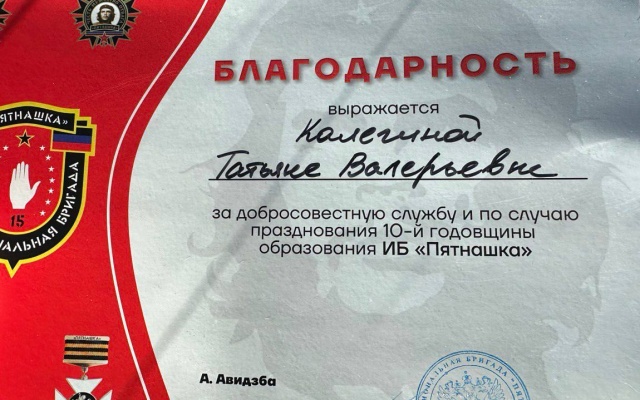 Член Бюро Президиума партии "РОДИНА" Татьяна Калегина удостоена благодарности командира интернациональной бригады "Пятнашка" Ахры "Абхаза" Авидзбы за добросовестную службу и по случаю празднования 10-й годовщины образования подразделения.