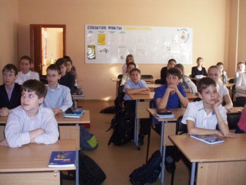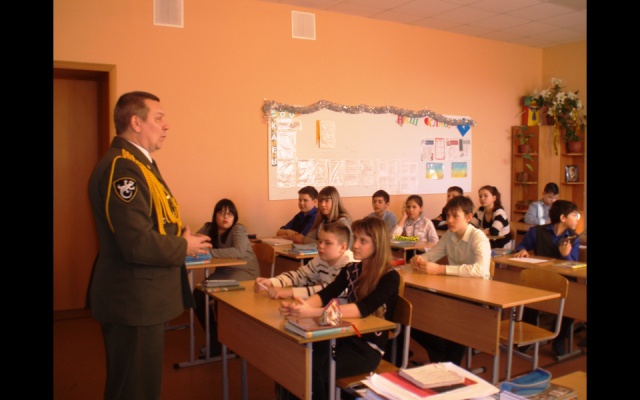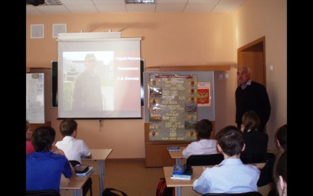 Прибывшие патриоты провели уроки мужества, на которых учащиеся посмотрели и обсудили видеофильм о Герое России Сергее Кислове — настоящем офицере и патриоте Отечества. Мальчишки и девчонки проявили большой интерес, задавали много вопросов и сами отвечали на вопросы почётных гостей. В ходе беседы были рассмотрены такие понятия как Родина, патриотизм, подвиг. Дети высказывали своё мнение, понимание сути этих слов. Обсудили и причины проявления фашизма на Украине.