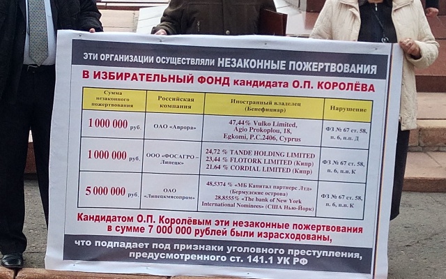 Пикет организован в связи с бездействием прокуратуры Липецкой области в части проверки выявленных фактов иностранного финансирования в крупных размерах избирательной кампании главы администрации Липецкой области Олега Королёва.