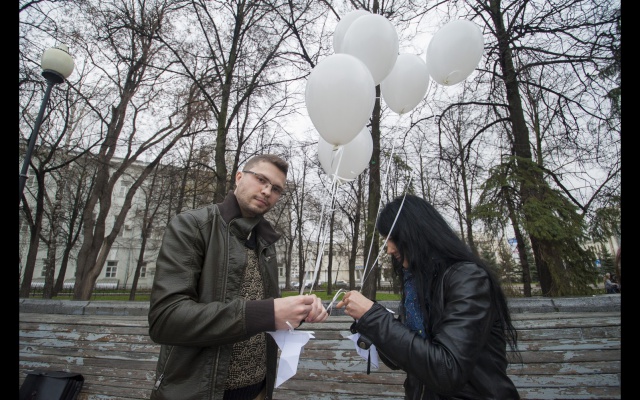 Участники, люди разных возрастов, большинство, конечно, студентов, сложили из бумаги белых голубей, по технике оригами. Тех, кто делал это впервые научили более опытные участники. Затем каждого "голубя мира" привязали к белому воздушному шару. Выстроившись в слово "мир", в едином порыве под дружный хор "Мы - за мир на Украине!" участники "запустили" в небо своих "голубей". К слову, в акции принимали участие и просто случайные прохожие-гости из Москвы, заинтересовавшиеся действом и поддержавшие идею мира на Украине.